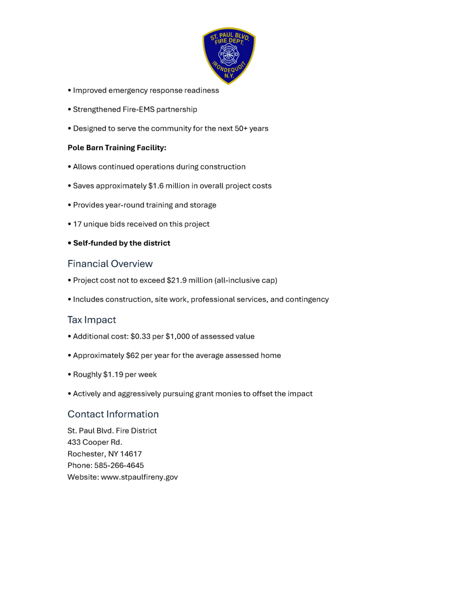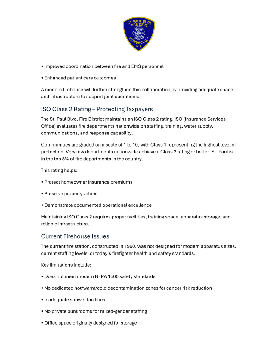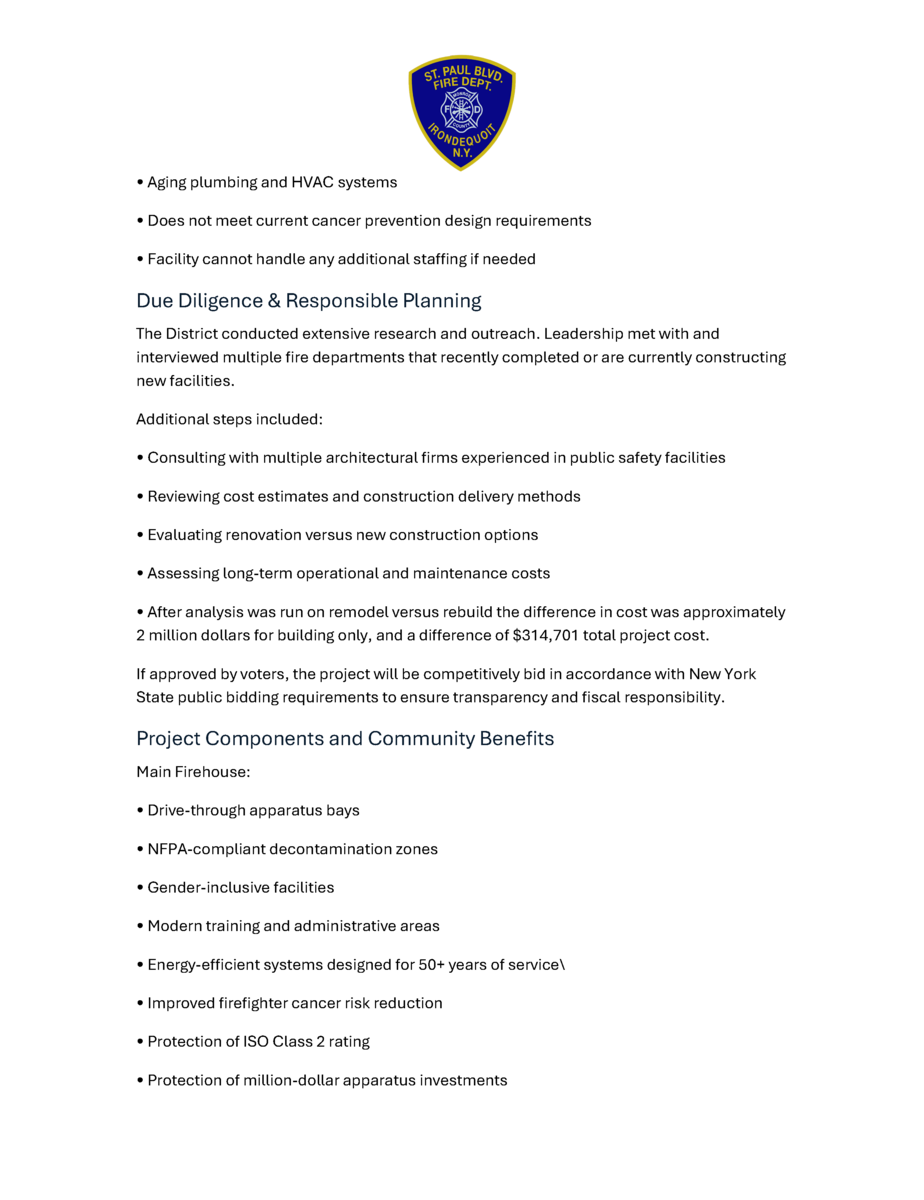 IRONDEQUOIT, N.Y. —The St. Paul Blvd. Fire District has released a series of detailed fact sheets outlining the need for a modern firehouse—information that will guide residents as public discussions continue this spring. The district is hosting three public information meetings on March 18, April 15, and May 20, all at 6:00 PM at the firehouse on Cooper Road, giving residents the opportunity to learn more and ask questions about the proposal.